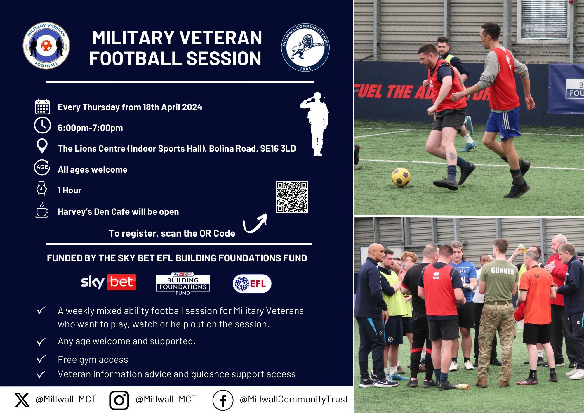 If you are a military veteran interested in playing, watching or helping out on the programme please contact Jscarborough@millwallcommunity.org.uk for further details.