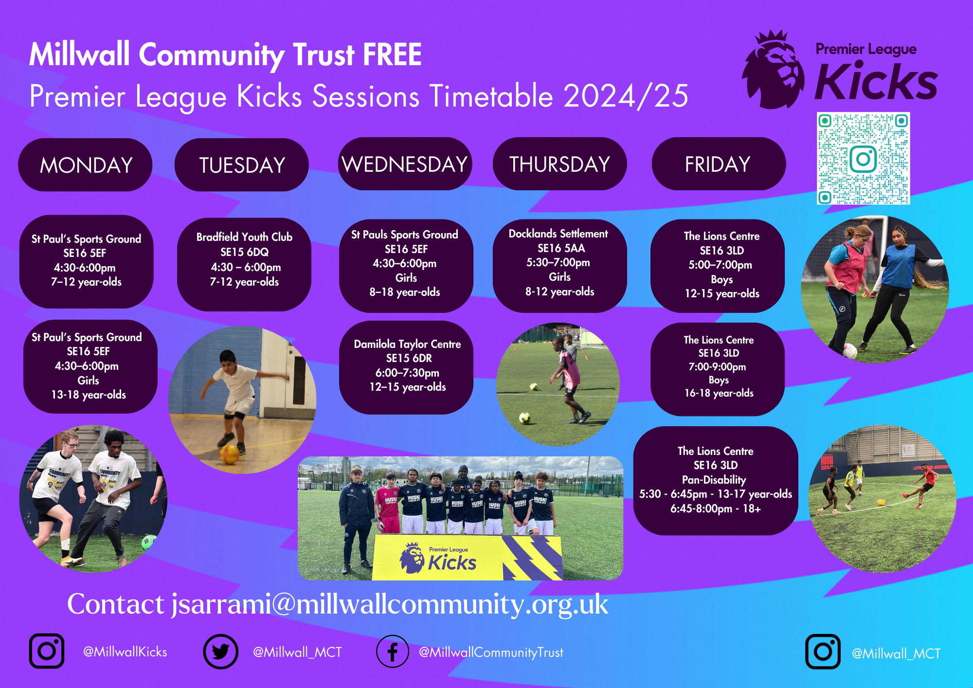Through the Premier League Kicks programme, Millwall Community Trust provides free weekly football sessions, youth work, mentoring opportunities workshops, social action and volunteering projects with the end goal of creating opportunities for young people to develop skills and improve their confidence.