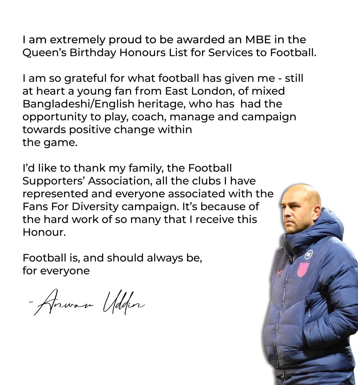 Millwall Community Trust (MCT) is delighted to learn that our "Fans United" partner, Anwar Uddin, has been awarded an MBE in the Queen's Birthday Honours List for his Services to Football.